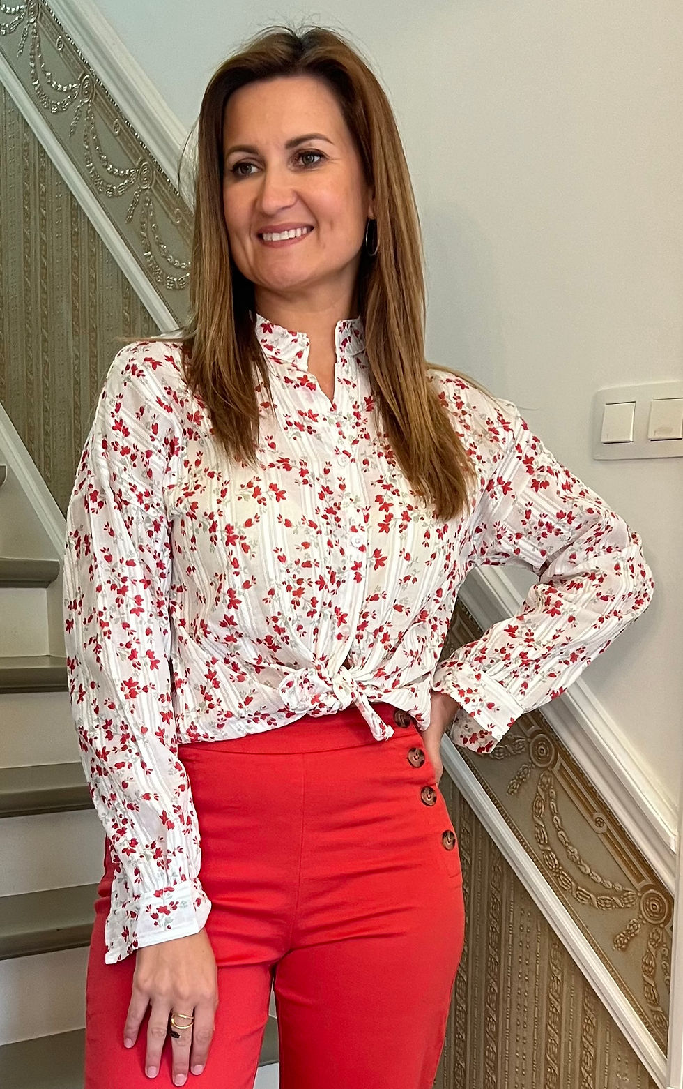 Rode broek met knopen aan de zijkant